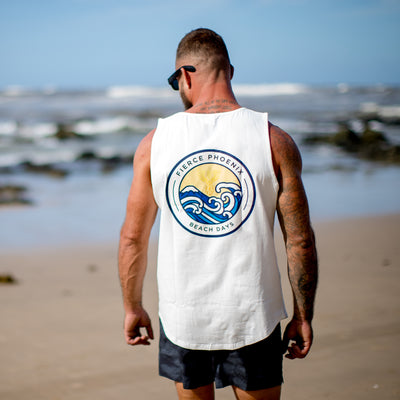 Breeze through summer with the Fierce Phoenix Beach Days Singlet. Designed for ultimate comfort and effortless style, this loose fit white singlet features the iconic Fierce logo on the left breast and a bold statement logo on the back, complete with vibrant beach waves.